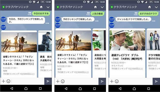 パナソニックは9月29日、会員制サイト「CLUB Panasonic(クラブパナソニック)」のLINE公式アカウントで、LINEのトーク上でテレビ番組の検索ができ、外出先からレコーダーの録画予約も可能な新サービスを開始した。
