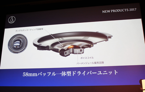 同社では初めて、ドライバーをバッフル一体型にした硬質樹脂(PPS)成型の「バッフル一体型φ58mmドライバー」を採用。大口径の性能を最大限に引き出すドライバー構成で、不要な音の歪みを極力抑える。