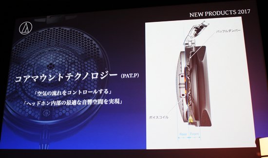 さらに、広帯域再生を実現する新開発ドライバーの性能を存分に発揮させるため、オーディオテクニカ独自開発の「コアマウントテクノロジー(PAT.P)」を設計に組み込んだ。バッフルダンパーとイヤパッドの位置関係を見直すとともに、耳からハウジングまでの音響空間を2分の1に仕切る位置にボイスコイルを配置する構造で、抜けるような音を再生する。