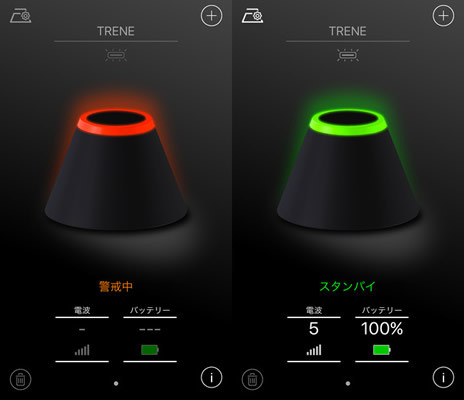 専用アプリ「TRENE」では、本体のLEDランプと同じ色で状態を表示する(画面イメージは開発中のもの)