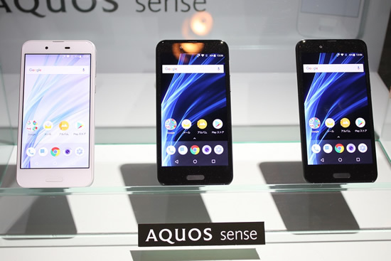 「AQUOS sense」は、スタンダードシリーズを統一する新シリーズ名称。16年冬発売のスタンダードモデル「AQUOS U」の約2倍の画素数を誇る「フルHD IGZO液晶ディスプレイ」を搭載する。また、画面や指が水に濡れていても誤動作が少なくスムーズに操作できる。