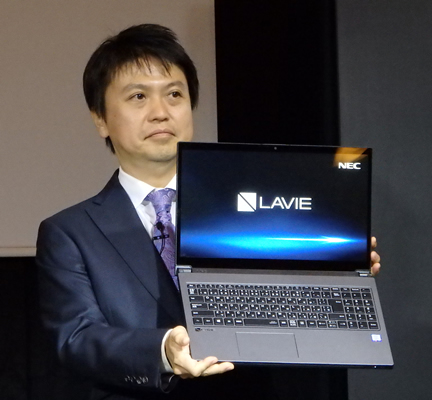 「LAVIE Note NEXT」は、高速SSDとHDDを搭載した最上位機種「NX850/JAB」など3機種をラインアップ。執行役員でコンシューマ事業を統括する河島良輔プレジデントは「これまでとはまったく違う上質なデザインで速い世界観を示した。A4ノートの上位機種のスタンダードになる」と意気込みを語った。