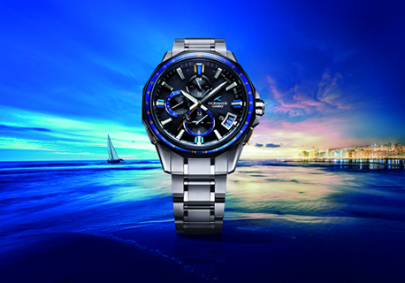 ブルーのサファイアガラスベゼルを採用し、オシアナスのブランドカラーを鮮やかに創出。ブルーのスパッタリングを施した4時側ディスクとともに、上質で傷が付きにくい両面無反射コーティングをした透明度99%のサファイアガラスベゼルにブルー蒸着させたことで、ブランドカラーを美しく表現した。時字は、立体的なバーインデックスによって見やすさを高め、同時に高い質感を実現。さらに、熟練の技を要するザラツ研磨など、細部に至るまで上質な仕上げを施した。