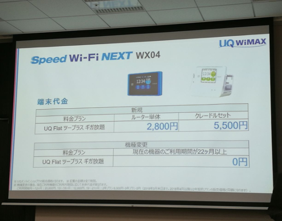 UQコミュニケーションズは10月23日、記者会見を行い、秋冬ラインアップのスマホ2機種とともに、440Mbpsモバイルルーター「Speed Wi-Fi NEXT WX04」を発表した。