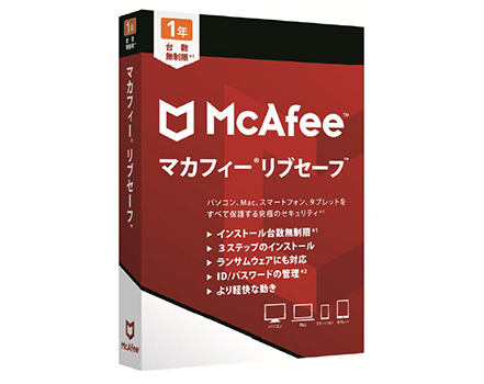 「マカフィー アンチウイルス(McAfee AntiVirus)」は、WindowsPC向けのセキュリティ対策製品。次世代エンジンによるマルウェア対策や双方向ファイアウォールを搭載する。PC1台が対象の1年版で、オンラインストアでのダウンロード販売価格は税込で2916円、パッケージ版の価格はオープン。上位モデルの「マカフィー アンチウイルス プラス(McAfee AntiVirus Plus)」は、Macを含むPCやタブレット端末、スマートフォンに対応する。台数無制限の1年版で、オンラインストアの税込価格は4212円。