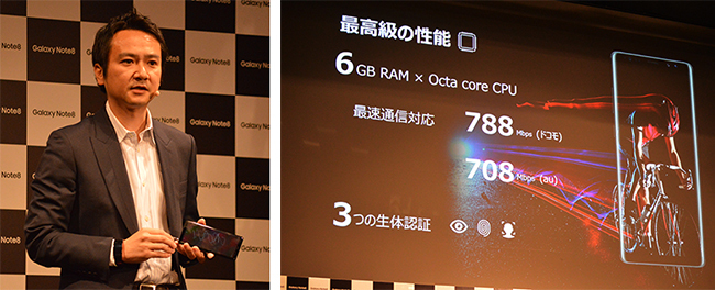 指紋・虹彩・顔の三つの認証を搭載しているのも特徴で、無線事業本部の猪股裕行プロダクトグループ課長は「普段は指紋、手袋をしているときは虹彩・顔とシーンによって使い分けができる」と、メリットを説明。6GBの大容量RAMや10nmモバイルプロセッサのOcta core CPUを搭載するなど、スペックも販売中のスマートフォンではトップクラスで、まさに死角のないフラグシップモデルに仕上がっている。