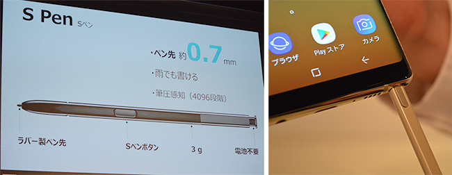 本物のペンと同じ書き心地を目指したというSペン。携帯時は本体に収納可能だ