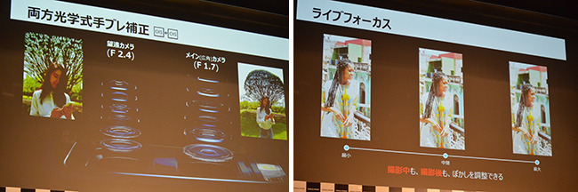 Galaxyシリーズとして初めて搭載するデュアルレンズカメラは、F値1.7の広角レンズとF値2.4の望遠レンズを搭載。望遠レンズは光学2倍ズームに対応する。二つのレンズを組み合わせることで、撮影時・撮影後にぼかしの強弱を調整できるライブフォーカス機能も備える。
