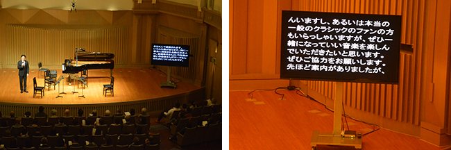 「みみともコンサート」にも同じ思いを込め、子どもから大人まで、難聴者から健聴者まで、誰でも音楽を楽しめるよう、例えば、ステージには話者のスピーチ内容を要約して字幕表示するモニター、観客席にはテレコイル対応の磁気ループシステムを設置するなど、誰もが気兼ねすることなくコンサートを楽しむことができるよう配慮した。