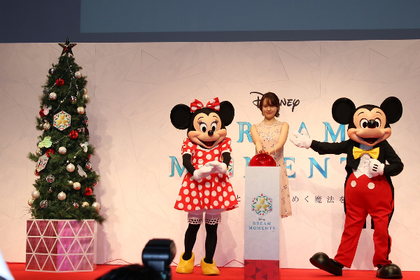 クリスマスツリーに点灯を行うトリンドル玲奈さんとミッキーマウス、ミニーマウス