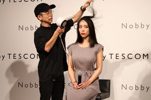 散髪したのちに、スタイリストの内田聡一郎さんが「Nobby by TESCOM」の新製品を使いながら紅蘭さんのヘアスタイルを整えた。内田さんは「『Nobby』ブランドはサロンでも人気。この風量・風速・温度を家庭で再現できる製品は他にない。非常に使いやすい」と感想を述べた。(BCNメディア編成部)