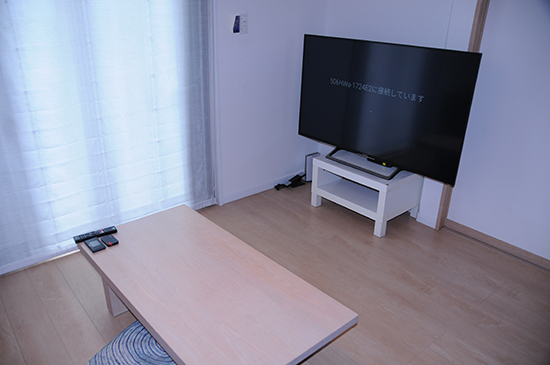 55型の「ブラビア 55X8500E」を設置。画面が薄い分、テレビ周りの空間が生まれ部屋が広く感じられた