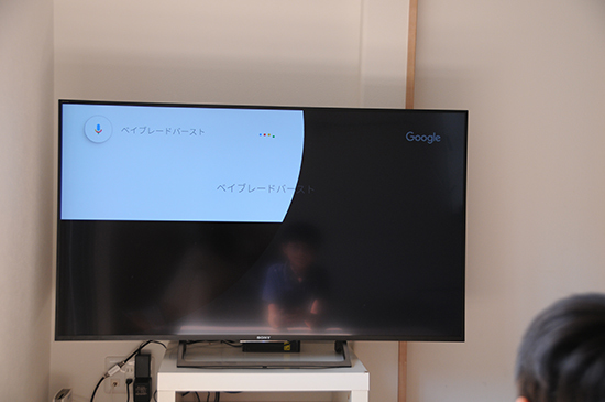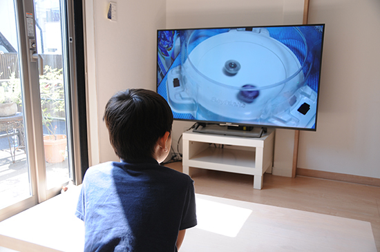 リモコンの先端にある音声検索ボタンを押して話しかけるだけで、いろんな映像を検索できるのも最近のテレビならではの機能だ。息子にリモコンを持たせると、さっそく学校の友だちの間で流行っている「ベイブレードバースト」を検索した。組み立て式のコマを、「攻撃」や「スタミナ」「守り」「バランス」など自分仕様にカスタマイズして戦わせる、現代版のベーゴマだ。子どものほうが、キーボード入力よりも簡単な音声検索機能に慣れている。物心ついた時からスマホの「音声検索ネイティブ」なので、「ブラビア 55X8500E」の音声検索も抵抗感なく使いこなした。音声を認識するスピードや正確性も高く、「ベイブレードバースト」の対戦状況を撮影したYouTubeの動画がスムーズに表示された。