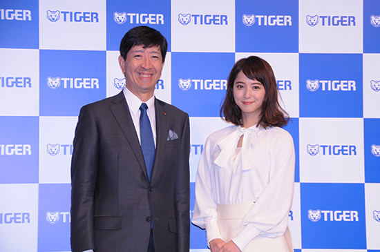 タイガー魔法瓶の菊池嘉聡社長と新イメージキャラクターの佐々木希さん