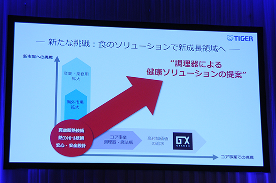 具体的には、タイガーが得意とする「真空断熱技術」と「高精度熱コントール技術」「安心・安全設計」の3つで培ってきた独自技術を軸にした健康ソリューションの分野で、既存の調理家電や魔法瓶の分野では高付加価値化の追求、新市場としての海外や産業・業務用への進出を目指していく。