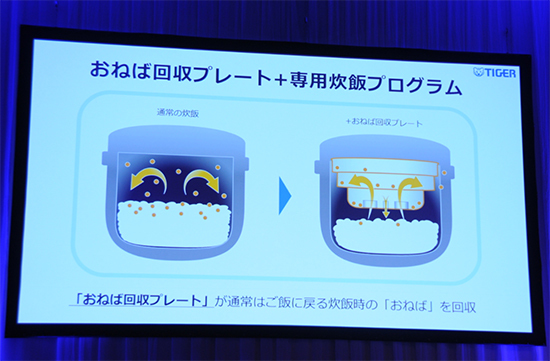 ごはんが飲み込みにくくなる原因を、炊飯の工程で発生するうまみ成分の「おねば」のべたつきや粘りにあるとし、炊飯しながら「おねば」を回収するプレートを開発した。