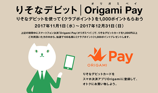 Origamiは11月1日~12月31日の期間に、りそなホールディングス傘下のりそな銀行、埼玉りそな銀行、近畿大阪銀行が発行する「りそなデビッドカード」と、Origamiが提供する「Origami Pay」の加盟店利用促進を目的とした共同キャンペーンを実施する。