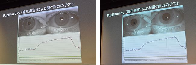 交感神経の変化で目の瞳孔は大きくなる。聴こえによって脳に負荷が生じることがこの実験で検証された