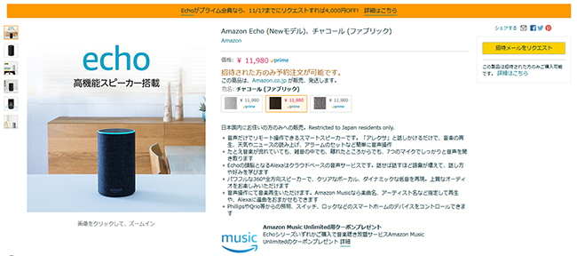 「Amazon Echo」は1万1980円、「Amazon Echo Plus」は1万7980円、「Amazon Echo dot」は5980円だが、期間限定のキャンペーンとして、11月17日23時59分までに注文したプライム会員には「Echo」は4000円、「Echo dot」は2000円割り引く。また、「Echo Plus」はスマートホームハブ対応製品である「Philips Hue」のスマート電球1個をセットで無料提供する。