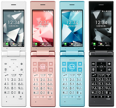 京セラ製の折りたたみ型端末「DIGNO ケータイ2」は12月中旬以降の発売で、カラーはホワイト、ピンク、ブルー、ブラックの4色。
