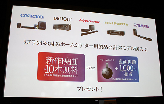 キャンペーンでは、2017年11月15日~18年1月31日の間に対象のホームシアター用製品を購入した消費者が、17年12月1日~18年2月7日の期間中に特設Webサイトから応募すると、もれなく5000円相当(新作映画約10本分)のビデオマーケット動画視聴ポイントか、Chromecastと1000円相当のビデオマーケット動画視聴ポイントを配布する。