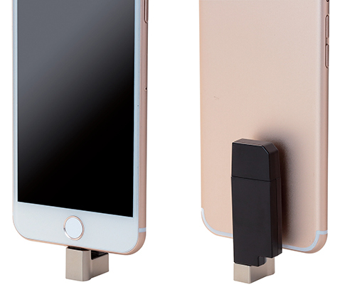 本体にUSB AコネクタとLightningコネクタを装備。さらに、USB Type-C変換アダプタ、USB microB変換アダプタが付属し、iPhone/iPadに加え、Android搭載スマートフォンやタブレット端末など、さまざまな端末から、電話帳、写真、動画などのデータを転送できる。