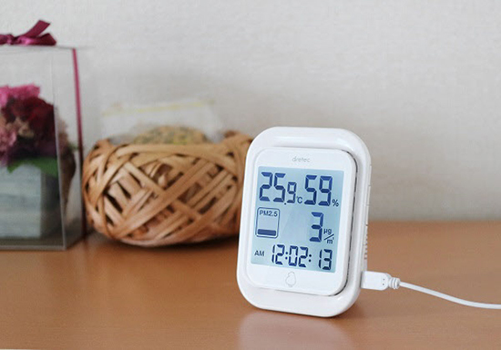 温度と湿度に加えて、PM2.5の濃度を数値と3段階のレベルで表示する温湿度計。バックライトの明るさは、室内の明るさに合わせて5段階で調節が可能で、カレンダー・時計表示にも対応する。