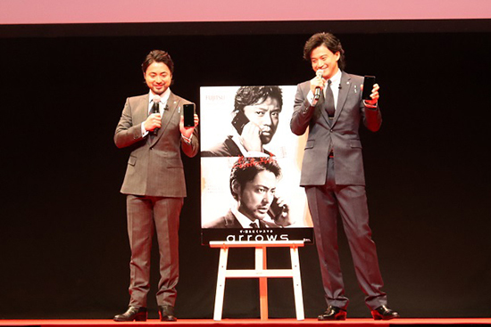 登壇した小栗旬さんは今回の新製品について「スマホを落として落ち込んだことがある。あの時『arrows』だったら大丈夫だったはず」と、実体験をもとにコメント。山田孝之さんは「片手でしかスマホを操作できない時でも便利に利用できる」と新製品の使用感を語った。(BCNメディア編成部)