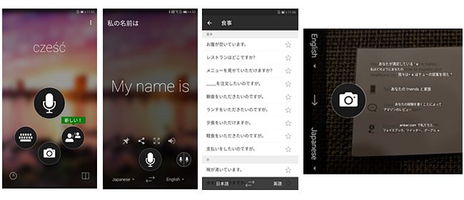 また、マイクロソフトのクラウドベースの自動翻訳機能をHUAWEI Mate 10 Pro向けにAIプロセッサによる高速化を施したカスタム版を搭載し、最大300%高速化。翻訳方法は音声、キーボード入力、画像認識、グループ会議の4種類で、画像認識以外は日本語に対応。日本語から、英語、中国語、韓国語、フランス語など、50以上のさまざまな言語に翻訳できる。もちろん、逆方向の翻訳も可能で、特に音声・画像からの翻訳は海外旅行時に役立つだろう。