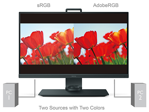 PCを2台同時に接続してPIP/PBPモードに切り替えると、画面を中央で2分割して、それぞれのPCの画面を個別に表示する「GamutDuo(ガンマデュオ)」機能が有効になる。同じ画像の色味をAdobe RGBモードとsRGBモードで比較するなど、異なる色空間のコンテンツを横に並べて比べることができる。