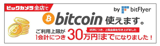 ビックカメラは12月8日から、全店で導入している仮想通貨「ビットコイン」を使った1会計あたりの決済上限金額を、従来の10万円相当から3倍の30万円相当に引き上げた。引き上げの対象店舗は、ビックカメラの全店(40店舗)のほか、コジマの7店舗、ソフマップの5店舗、ビックカメラアウトレットなど10店舗。
