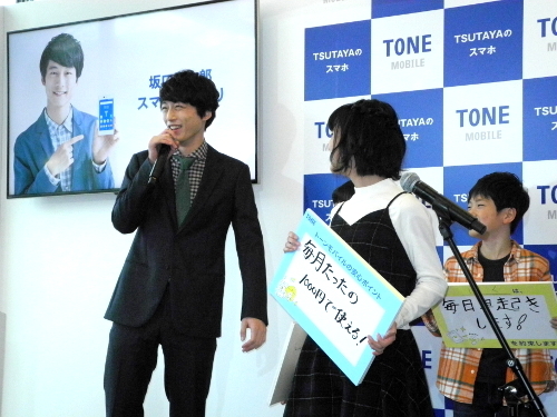 会見にはイメージキャラクターの坂口健太郎さんが登壇し、子供のスマホおねだりの練習相手を務めた。(BCNメディア編成部)