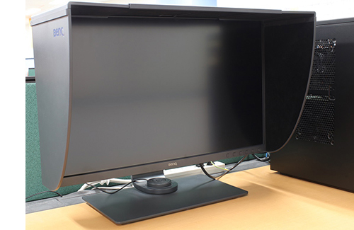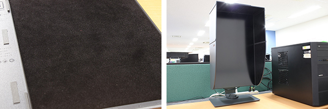 「遮光フードが付属するのもうれしい。光の反射を抑える黒くやわらかい布が内側に貼っており、性能は優れている。ディスプレイの価格に遮光フードが含まれているのは消費者に対する優しい配慮だと思う」という。遮光フードは従来機種「SW2700PT」に引き続き付属し、今回は新たに画面を縦にした際に使用できるフードを追加している。