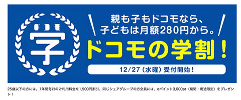 「ドコモの学割」は、「Xi」契約で、料金プラン「カケホーダイ&パケあえる」の基本プランと「spモード」、対象の「パケットパック」またはシェアパック子回線で「シェアオプション」に加入に新たに申し込むと、毎月の利用料金1500円を1年間割り引く、25歳以下のユーザーを対象にしたキャンペーン。受付期間は12月27日~2018年5月31日。