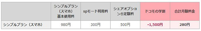 「ドコモの学割」適用時の月額料金(「シェアパック」の子回線として新規契約した場合、契約後1年間)