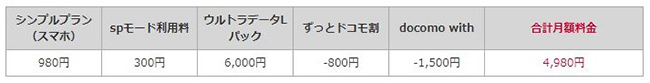 今回の「シンプルプラン」の適用拡大によって、現在「データMパック(5GB)」と5分以内の国内通話が無料の「カケホーダイライトプラン」を契約しているユーザーは、プラス月額280円追加するだけで、現状の4倍のデータ量の20GBを利用できるようになる。月額料金は、「docomo with」の場合で4980円から。