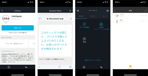 まずは、Alexaアプリ上でLinkJapanスキルを有効にし、アレクサに話しかけて、新しいスマートホームデバイスを検出。