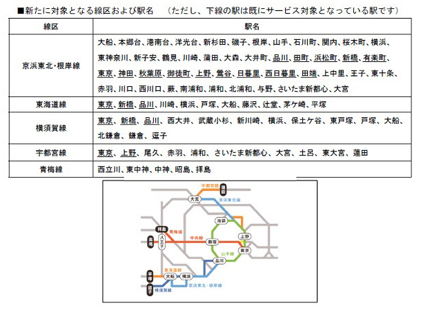 2017年10月1日のサービス開始時点では、対象駅は山手線、中央線の57駅だったが、今回、さいたまエリアや横浜エリアを中心に5線区54駅を対象に追加し、計7線区111駅で利用できるようにする。