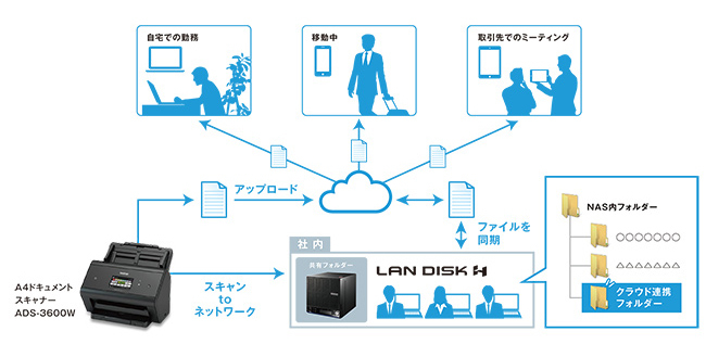 今回、LAN DISKシリーズへの直接保存に対応した4機種は、タッチパネルとネットワーク(有線LAN/無線LAN)を標準搭載したモデル。PCを介することなくスキャンデータを直接HDDにアップロードできるため、従来発生していたPCにスキャンデータを取り込んでからNASに移動する手間がなくなり、業務の効率化を図ることができる。