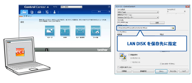 「Control Center4」を使用すれば、スキャンデータの保存先を「LAN DISK」に変更できる