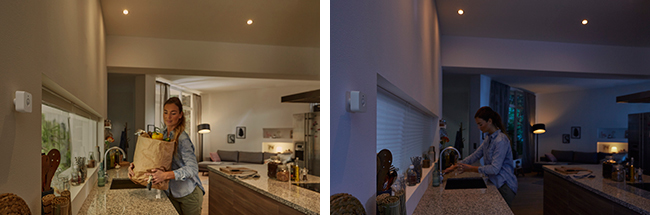 本体から発する赤外線センサで動作を感知し、自動的に「Philips Hue」を点灯/消灯するモーションセンサ。点灯後、あかりをつけたままにせず、あらかじめ設定した時間に消灯できるほか、専用アプリ「Hueアプリ」で設定すれば、最大3か所の「Philips Hue」を同時に操作可能なので、帰宅時に玄関と廊下、リビングの照明を点灯する、といった使い方にも対応する。