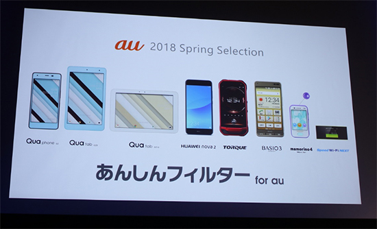 そのほか、auオリジナルのスマホ「Qua phone」とタブレット端末「Qua tab QZ10」や「Qua tab QZ8」、スマホ初心者向けの機能を搭載した「BASIO3」、子どもの安全を守る「mamorino4」、受信速度最大708Mbpsに対応したWi-Fiルータ「Speed Wi-Fi NEXT W05」をラインアップ。また、販売中のタフネススマホ「TORQUE G03」のカラーに新色レッドを追加する。(BCNメディア編成部)