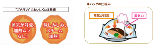 耐熱性の高いジッパー付きバッグに蒸気口がついており、材料と調味料を入れて電子レンジで加熱するだけで、じっくり煮込んだようにおいしい一品が短時間で簡単に作れる。食材から出る蒸気でバッグが膨らみ、約1.1気圧、102℃の「プチ圧力」がかかるので、食材が短時間で軟らかくなり、じっくり煮込んだようにおいしい料理ができるという。調理バッグメーカーとライオンが共同開発した、独自設計の蒸気口が蒸気の圧力を調節し、加熱ムラを防ぐ。