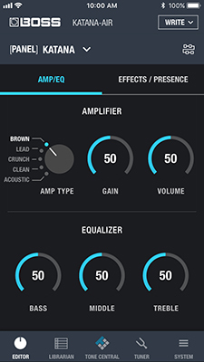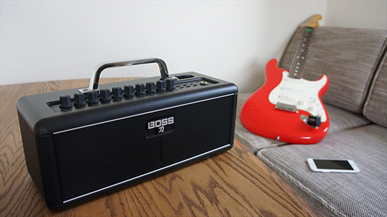 ギタリストが求める迫力ある歪み(ひずみ)と、豊かな表現力で高い評価を得ているボスの「KATANAアンプ・シリーズ」のサウンドを搭載。本体には6種類の音色をプリセットし、ツマミ操作で調整できるほか、Bluetooth接続したスマートフォン/タブレット端末から専用アプリで細かに音色を作成することもできる。