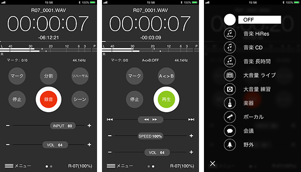 Android/iOS対応の専用アプリ「R-07 Remote」を使用すれば、Bluetooth接続したスマートフォンから録音/停止の操作、録音レベルや時間の確認、各種設定の変更が可能で、Apple Watchからの録音/停止にも対応している。また、Bluetoothオーディオ送信にも対応しているので、スマートフォやとBluetooth対応ヘッドホン/スピーカーを接続すれば、本体の録音データをワイヤレス再生できる。