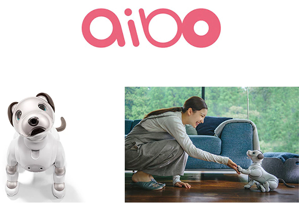 「aibo」は、家庭の中で人とつながりをもち、育てる喜びや愛情の対象となることを目指して開発したロボット。サイズは幅180×高さ293×奥行305mm、重量は約2.2kg。連続稼動時間は約2時間で、充電時間は約3時間。
