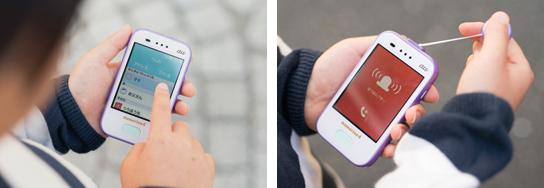 タッチ操作が可能な約2.8インチ液晶ディスプレイと、音声操作で電話発信やメッセージ(SMS)画面の呼び出しが可能な「音声操作補助機能」を搭載。音声操作は、タイマー・ストップウォッチ、歩数計、録音、ボイスチェンジといった、子ども向け機能の呼び出しにも対応する。