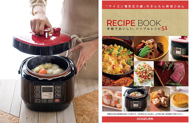 「朝・昼・夜ごはん」「おもてなし」「おつまみ」「作り置き」「ヘルシースイーツ」のカテゴリに分け、計51種類の料理を収録した料理研究家の平沢あや子氏監修によるレシピブックが付属。レシピにはそれぞれ5段階の圧力設定が明示されているので、簡単に料理が作れる。