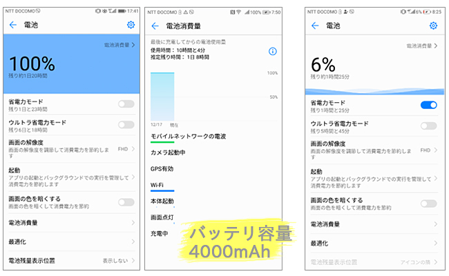 Leicaのダブルレンズカメラと並ぶ「HUAWEI Mate 10 Pro」の特徴は、4000mAhの大容量バッテリを搭載し、ヘビーユーザーなら1日以上、一般的な使い方なら、約2日間使える長持ちするバッテリ。独自の急速充電「HUAWEI Super Charge」にも対応しており、わずか約30分の充電で、バッテリ残量ゼロの状態からほぼ丸1日使える水準の58%まで回復する。就寝時ではなく、毎朝、出かける前にさっと充電すれば十分ということだ。この驚異的なバッテリもちのよさは、AIがユーザーの使い方を日々学習し、それにあわせて消費電力を細かくAIが制御する仕組みによるもの。実際に、MVNOのデータ通信専用SIMカードを入れ、フル充電からバッテリ残量ゼロになるまでの経過時間を計ったところ、驚くほどバッテリーが長持ちした。一部のアプリの機能を限定する「省電力モード」では3日以上、通常モードでも、長時間のテザリングやインターネット検索・SNSを利用したにも関わらず、丸2日以上もち、「まだ充電しなくていいの?」と、逆に心配になるほどだった。