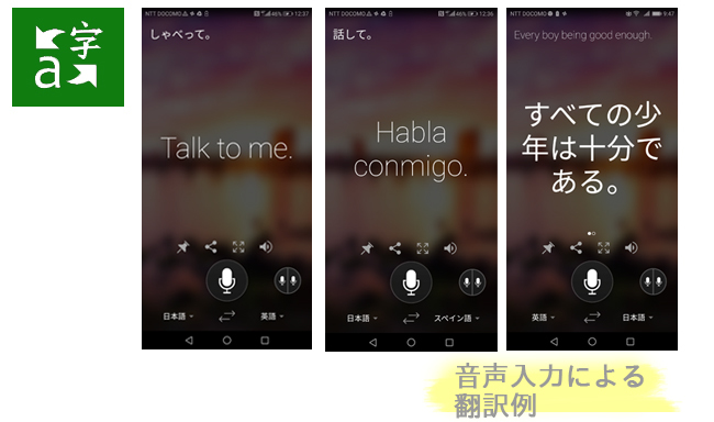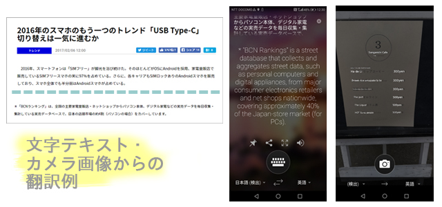翻訳方法は音声、テキスト、画像から翻訳可能。翻訳結果は、全画面で表示したり、